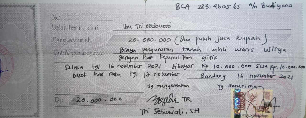 Dicari, Ketua Yayasan Lembaga Fakta Hukum Indonesia, Ir Budiyono SH MH. Diduga Kabur Udah 5 Tahun Lebih Ngga Bayar Hutang Rp 27.500.000 Untuk Pengurusan Tanah An Wirya dan Sertifikat Hak Milik Tanah Tri Setiowati Di Belakang Polda Jawa Barat.
