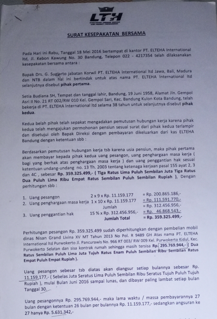 Sejak Surat Kesepakatan Bersama, Almarhum Suami Saya Setia Budiana SH dengan pemilik PT Elteha Internasional, Pada Hari Rabu, 18 Mei 2016 bertempat di Kantor PT Elteha Internasional Jl Kebon Kawung No 30 Bandung Telpon 022 4217359 telah dilaksanakan surat kesepakatan bersama antara PT Elteha Internasional Ltd Jawa Bali Madura N NTB dengan Setia Budiana SH.Tempat Tanggal Lahir Bandung 19 Juni 1958. Alamat Jl Gempol Asri No 21 RT 002/ RW 010 Kelurahan Gempol Sari Kecamatan Bandung Kulon Kota Bandung Telah bekerja di PT Elteha Internasional selama 38 Tahun yang selanjutnya disebut Pihak Kedua.