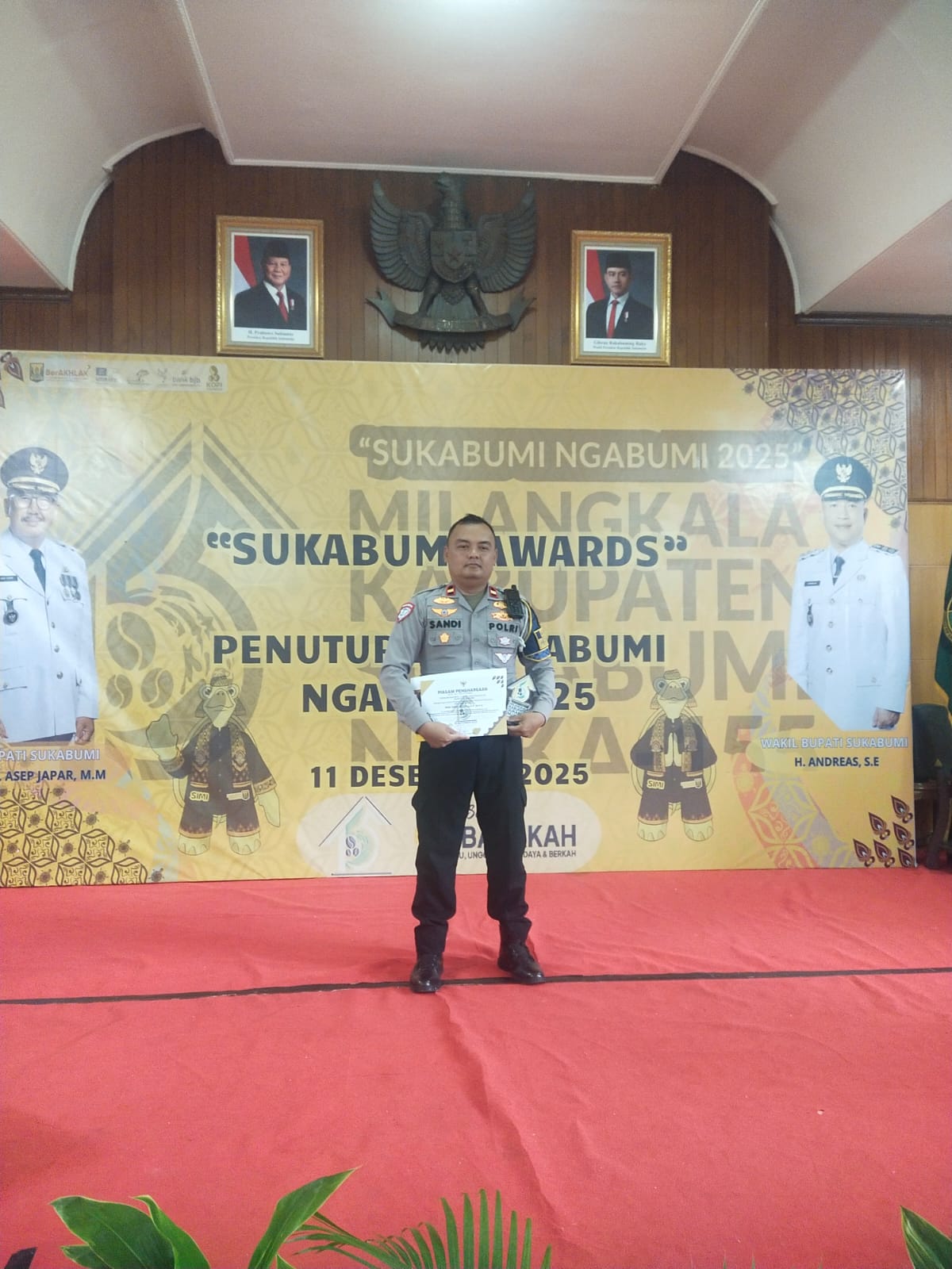 Penghargaan tersebut diberikan langsung oleh Bupati Sukabumi Asep Jafar dalam ajang Sukabumi Awards 2025, yang sekaligus menjadi rangkaian penutupan kegiatan Sukabumi Ngabumi 2025 yang berlangsung di Aula Pendopo Sukabumi pada Kamis (11/12/2025) dan disaksikan oleh Wakil Bupati Sukabumi Andreas, Sekretaris Daerah (Sekda) Ade Suryaman, unsur Forkopimda, serta tamu undangan lainnya.